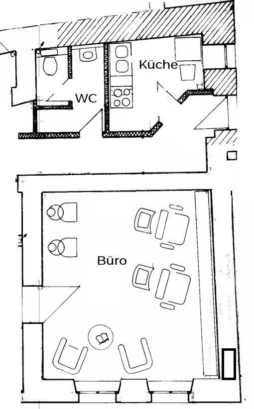 Das Büro selbst überzeugt durch seine ebenerdige Lage, die einen bequemen und barrierearmen Zugang ermöglicht. Die sanitären Einrichtungen sowie eine Küche sind nicht direkt in die Bürofläche integriert, sondern separat über den gemeinschaftlichen Hausflur erreichbar.