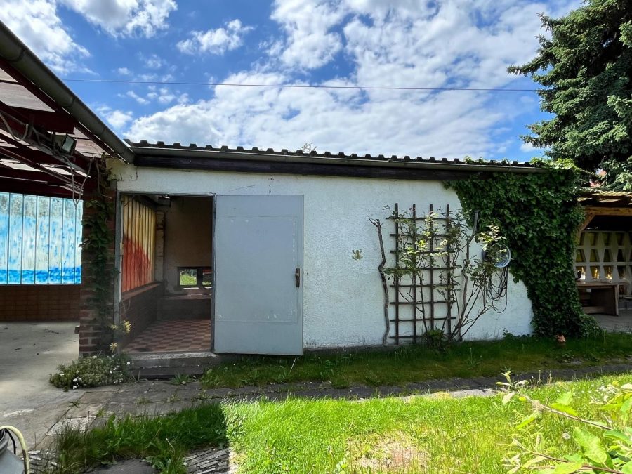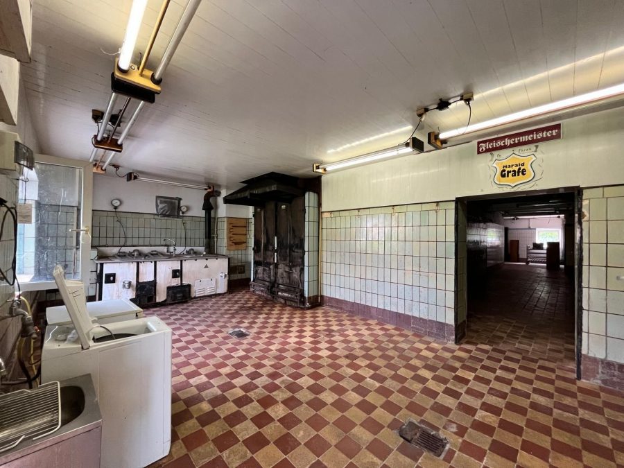 Drei geräumige Garagen bieten ausreichend Platz für Fahrzeuge, Werkzeuge oder Materialien und ermöglichen somit eine flexible Nutzung für Handwerker, Bastler oder Gewerbetreibende. Die ehemaligen Produktionsräume der Fleischerei können ideal als Werkstatt oder Lagerflächen umfunktioniert werden.
