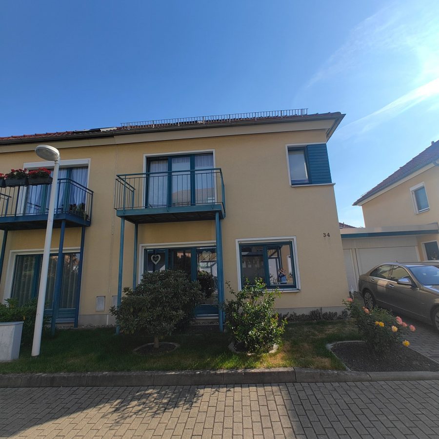 Das Haus befindet sich in einer ruhigen Wohnsiedlung im Stadtteil Biesnitz. Das Grundstück umfasst 241 m² und gliedert sich in einen gepflegten Vorgarten, die bebaute Fläche mit Reihenhaus und Garage und einen idyllischen Hofgarten.