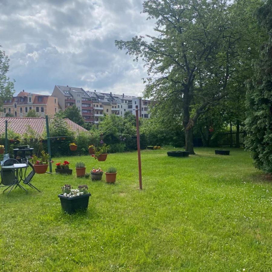 Das Gründerzeithaus schließt rückseitig mit einem kleinen gepflasterten Hof und einer höher gelegenen, teilweise eingefriedeten Grünfläche ab.