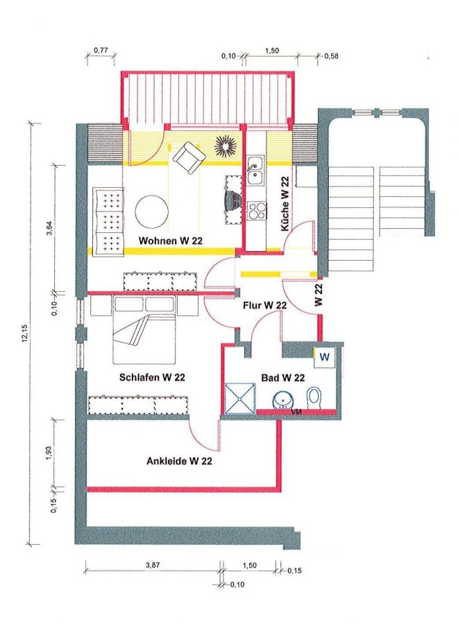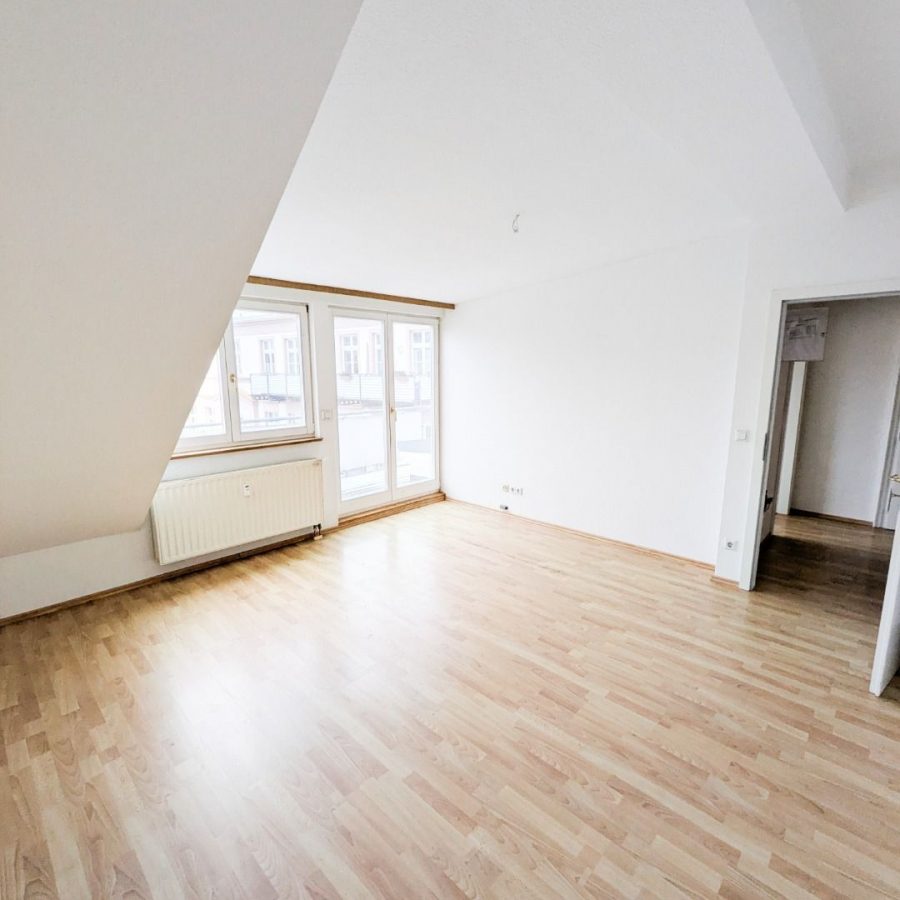 Die Wohnung bietet auf ca. 57 m² zwei helle, gut geschnittene Wohnräume sowie ein weiteres kompaktes Zimmer in der Dachschräge, das sich ideal als Arbeits-, Abstell- oder Nebenraum nutzen lässt. Die separate, freundliche Küche ist mit einer Einbauküche ausgestattet und erhält viel Tageslicht. Ein Balkon erweitert den Wohnraum und erhöht die Wohnqualität zusätzlich.