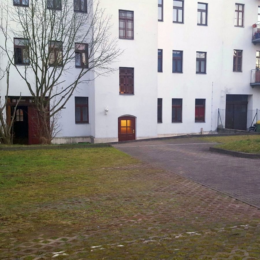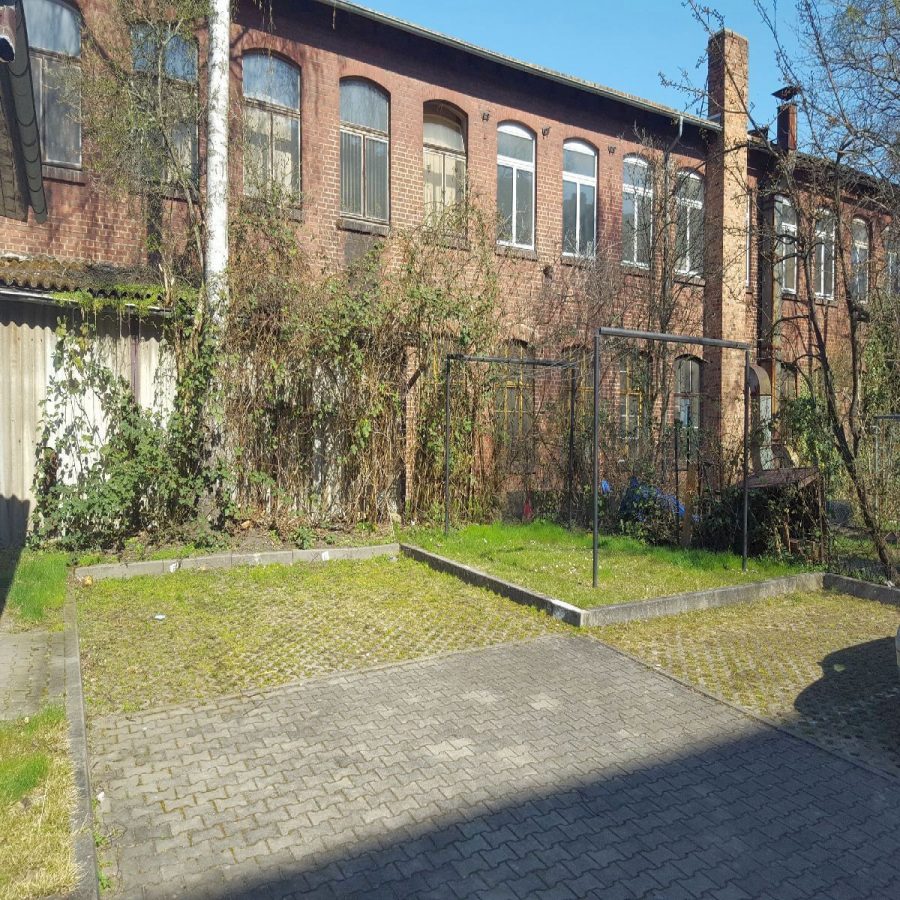 Rückseitig schließt das Haus an einen teilweise gepflasterten, teilweise begrünten Innenhof an. Dort befinden sich insgesamt elf Stellplätze, von denen einer der angebotenen Wohneinheit zugeordnet ist.