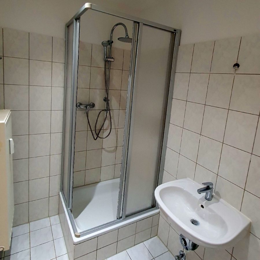 Die ca. 35 m² große 1-Raum-Eigentumswohneinheit befindet sich im 2. Obergeschoss des denkmal-geschützten Mehrfamilienhauses. Die Wohnung besteht aus einem Flur / Eingangsbereich, einem innenliegenden Bad mit Dusche sowie Waschmaschinenanschluss und einem großzügigen, hellen Wohnraum mit offenem Zugang zur Küche im amerikanischen Stil. Zur Wohnung ist ein Kellerabteil als Nebengelass zugehörig. Flur und Wohnbereich sind mit Laminat ausgelegt, Bad und Küchenbereich sind gefliest. Die Wände sind mit Raufasertapete weiß tapeziert.