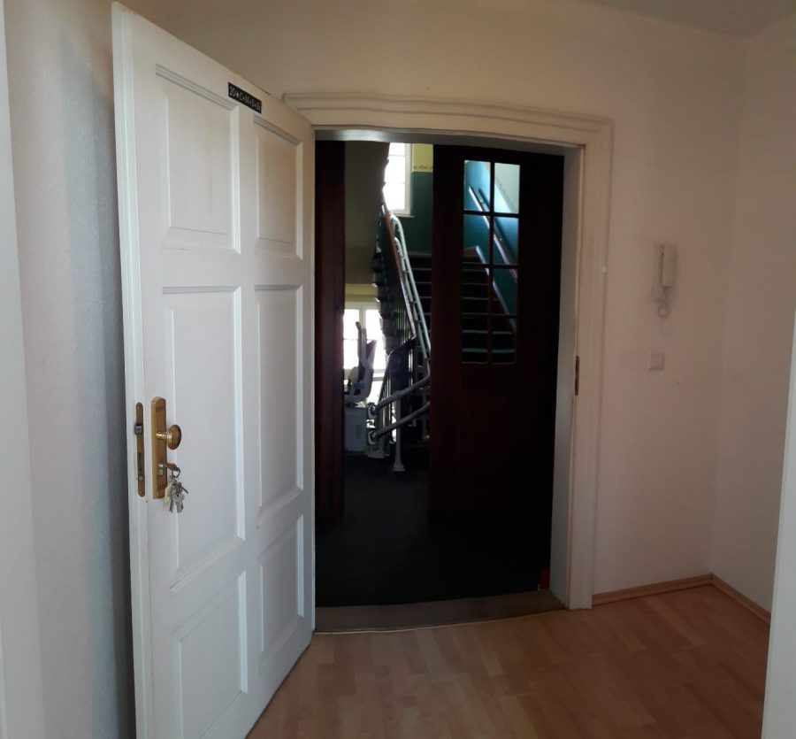 Diese gepflegte Wohnung im Rahmen des betreuten Wohnens bietet älteren Menschen ein sicheres und komfortables Zuhause in zentraler Lage. Der Zugang wird durch einen installierten Treppenlift erleichtert, sodass auch mobilitätseingeschränkte Bewohner bequem in die Wohnung gelangen. Der kompakte Flurbereich sorgt für eine klare Raumaufteilung und führt direkt zu den Wohnbereichen.