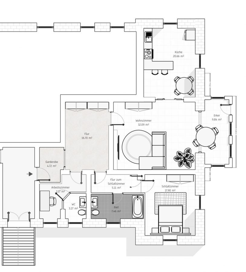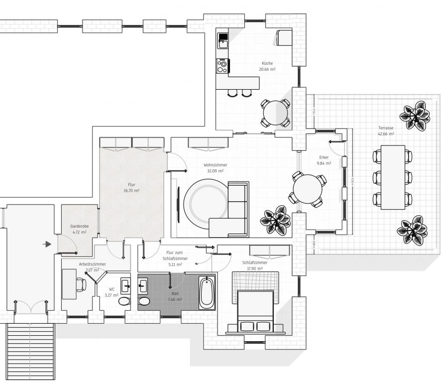 Ein besonderer architektonischer Akzent ist der Erkerbereich, der zusätzlichen Raum für einen Essplatz oder eine gemütliche Sitzecke schafft. Von der Wohnung aus gelangen Sie direkt auf die großzügige Dachterrasse, die vielfältige Nutzungsmöglichkeiten bietet und den Wohnraum nach außen erweitert.