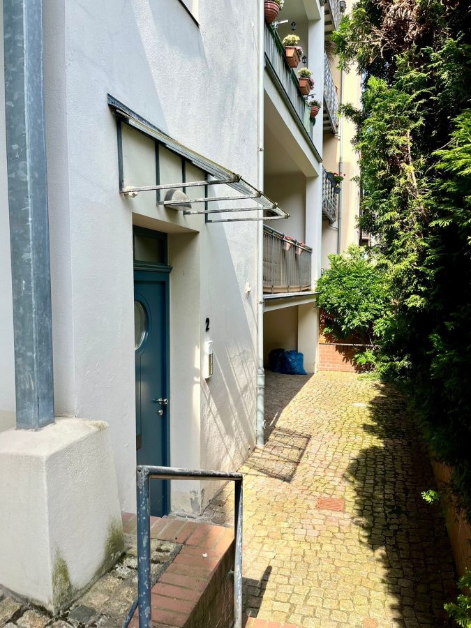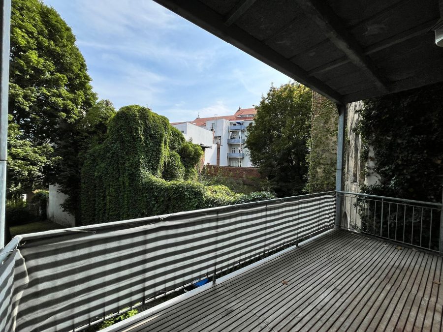 Das Badezimmer ist mit einer Badewanne ausgestattet. Das Schlafzimmer liegt hofseitig und garantiert dadurch ruhige Nächte. Auch von hier aus haben Sie Zugang zum weitläufigen Balkon.